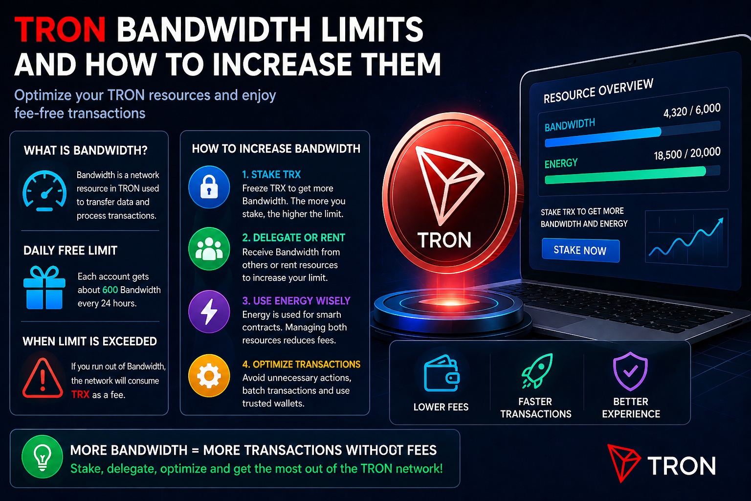 A detailed guide to Bandwidth limits in the TRON network: how they are allocated, consumed, and the ways to increase the available limit for fee-free transactions.