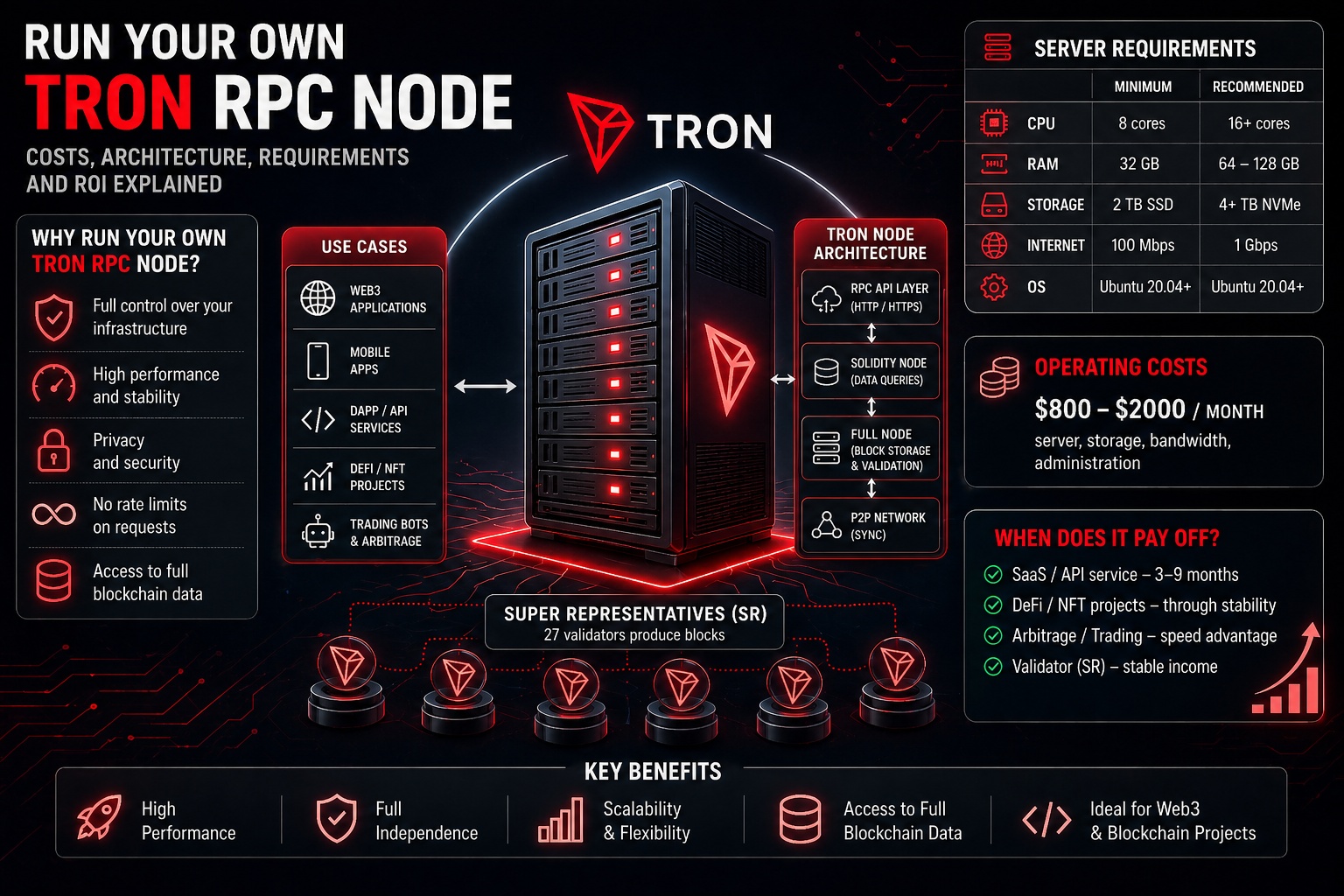 Подробный разбор запуска собственного узла TRON и RPC-сервера: архитектура сети, технические требования, расходы и реальные сценарии окупаемости в 2026 году.