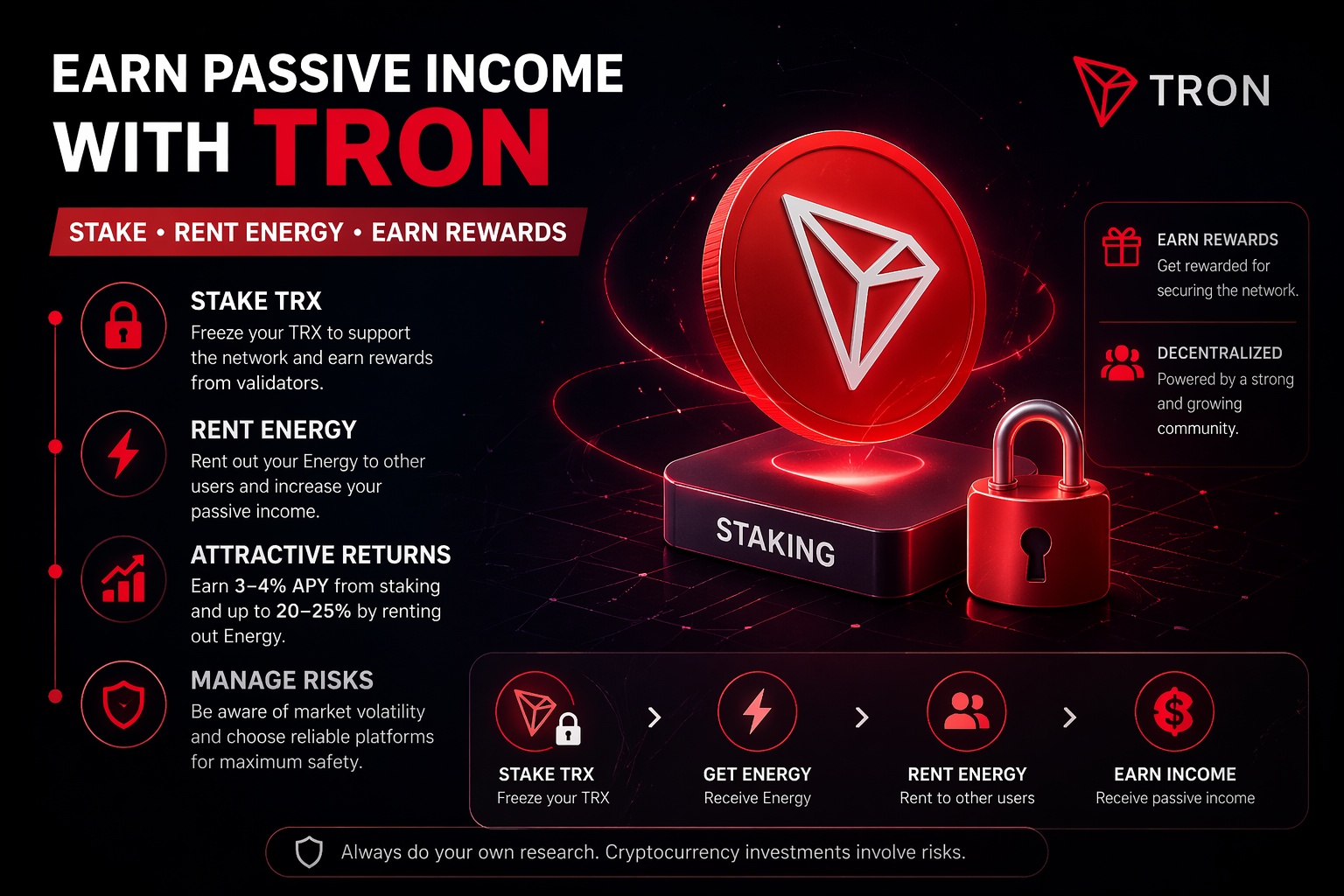 了解如何通过 TRON(TRX)质押和能源租赁赚钱。完整指南,年收益最高可达 25%,并附带分步操作说明。
